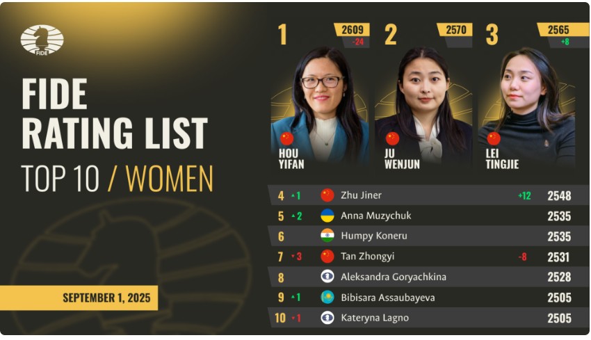 এদিকে নারী র্যাঙ্কিংয়ে ঝু জিনের তার উত্থান অব্যাহত রেখেছেন। ইসব্যাংক অফ টার্কিয়ে চেস সুপার লিগে তার দুর্দান্ত পারফরম্যান্স তাকে ১২ পয়েন্ট এনে দেয় এবং ক্যারিয়ার সেরা ২৫৪৮ পয়েন্টে উন্নীত করে।