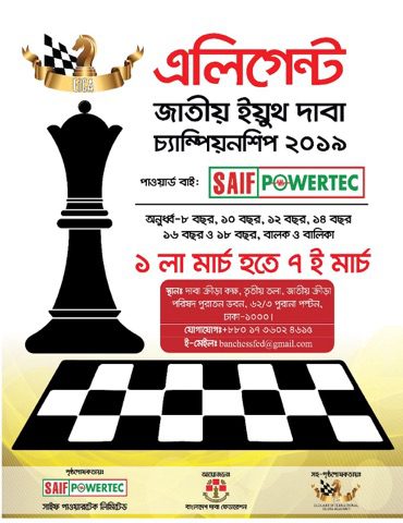 এলিগেন্ট জাতীয় ইয়ুথ দাবা চ্যাম্পিয়নশিপ আগামীকাল ১ মার্চ শুক্রবার থেকে বোর্ডে গড়াচ্ছে। ঘরোয়া দাবার এ নতুন আসরে অন্তর্ভুক্ত থাকছে অনূর্ধ্ব-৮, অনূর্ধ্ব-১০, অনূর্ধ্ব-১২, অনূর্ধ্ব-১৪, অনূর্ধ্ব-১৬ ও অনূর্ধ্ব-১৮ ক্যাটাগরি।