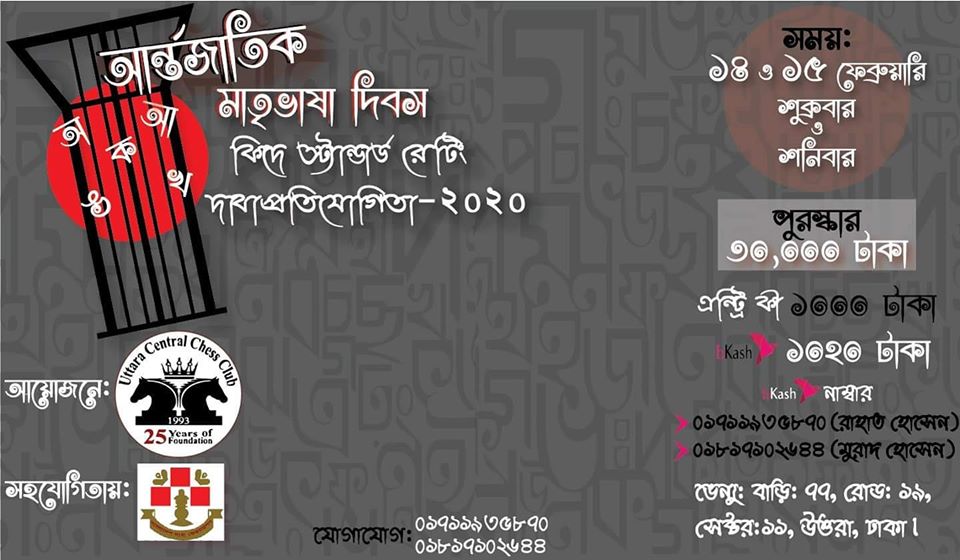 উত্তরা সেন্ট্রাল চেস ক্লাব আয়োজিত ‘আন্তর্জাতিক মাতৃভাষা দিবস ফিদে স্ট্যান্ডার্ড দাবা প্রতিযোগিতা আগামী ১৪ ফেব্রুয়ারি থেকে শুরু হতে যাচ্ছে।